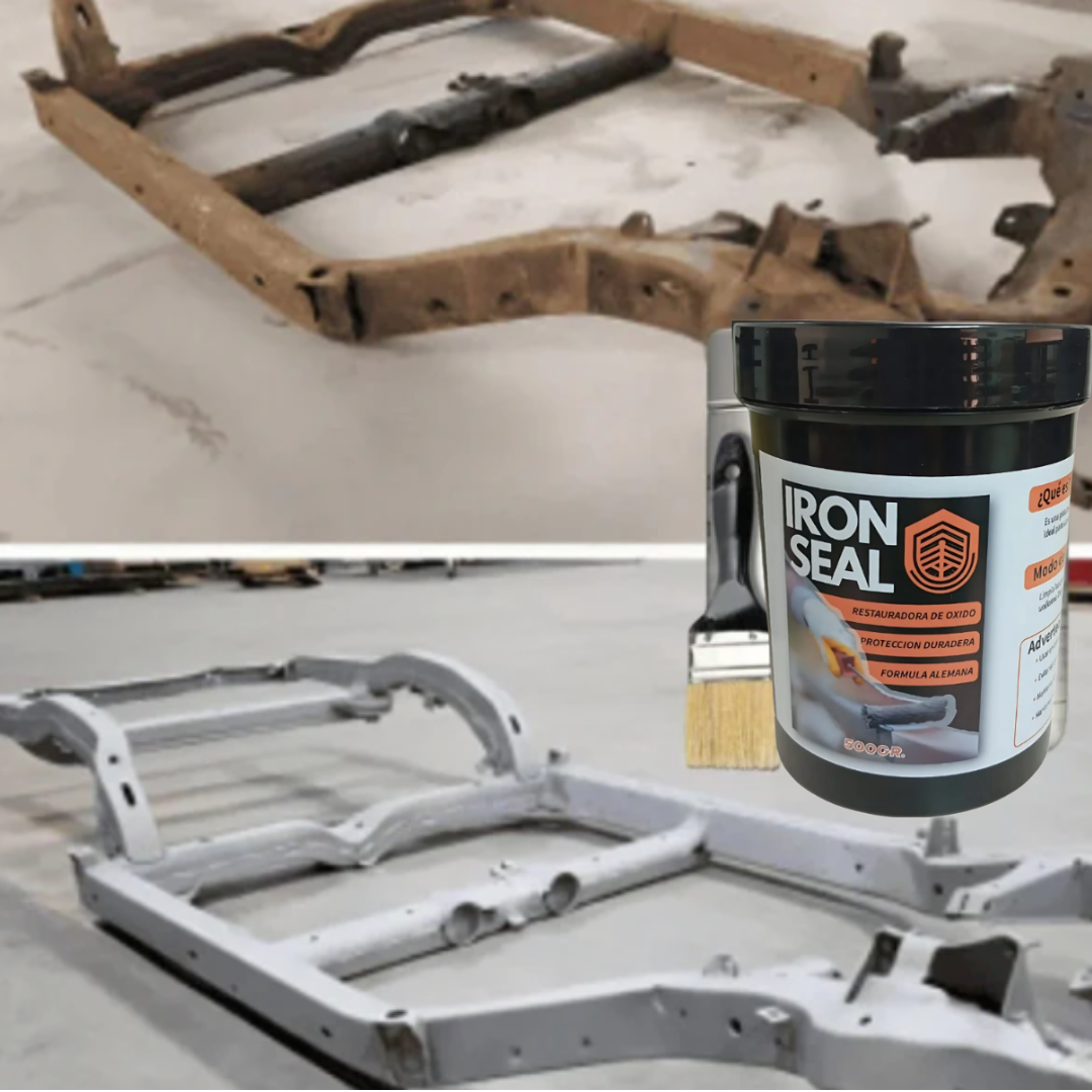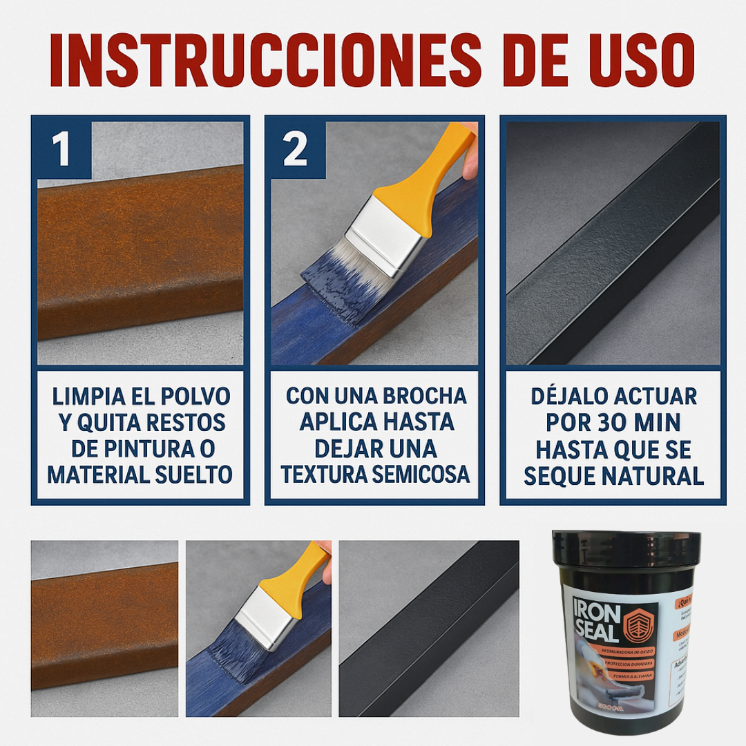 👉 Solo debes limpiar el polvo o material suelto, aplicar IRON SEAL con brocha o rodillo sobre la superficie oxidada y dejar secar para que forme la capa protectora.